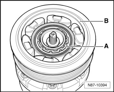 - Insert drive plate - C - far enough into rubber elements - D - until it contacts A/C compressor shaft - B -.