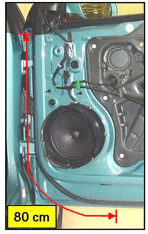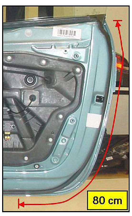 ^ Mark the rearward hole to be cut on outer door seal 80 cm. from the top.