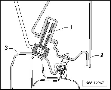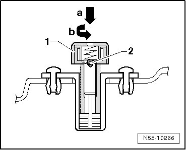 - Press the adjusting buffer - 1 - together - arrow a - and turn it 45° - arrow b -.