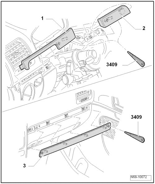 - Pry trim panels - 1 - and - 2 -out of instrument panel on driver side using trim removal wedge (3409).