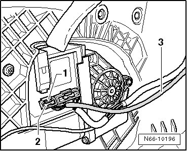 - Open the retainer - 1 - and disconnect the connector - 2 - for the exterior mirror from the window regulator motor.