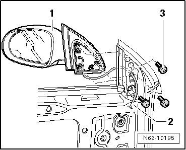 - Remove exterior mirror - 1 - and guide the wire - 2 - through opening in door.