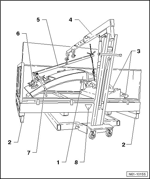 - Guide Shop Crane (VAS 6100) - 1 - with Lift Arm Ext./Workshop Hoist (VAS 6101) - 4 - on marking - 8 - under transport box.