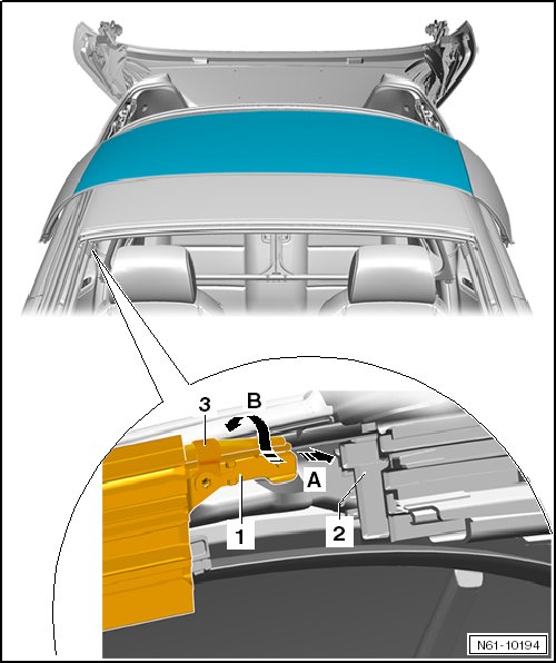 - Turn the guide rail until the clip audibly latches into the roof pillar - arrow b -.