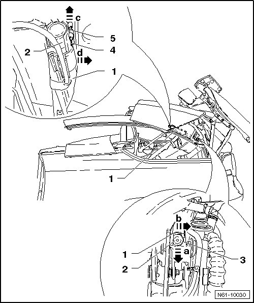 - Place the hinge supports (VAS 6365) in the mounting hole in the main hinge - 1 - and rotate the base - 4 - so that it is not positioned in the opening in the longitudinal.