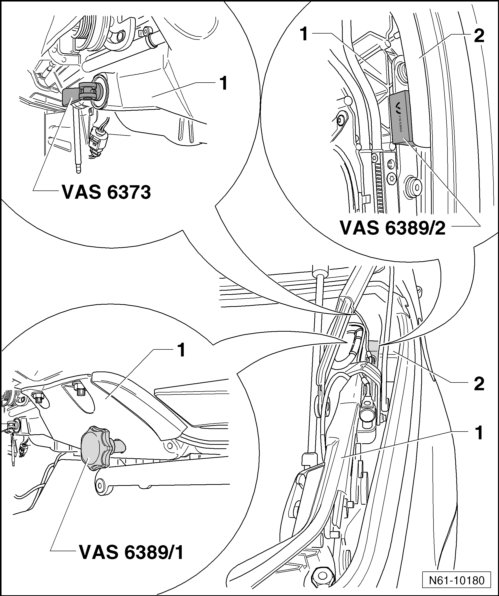 • The assembly frame and locking bracket are clamped with the tensioning element for Eos (VAS 6373) and pre-tensioning tool (VAS 6389).
