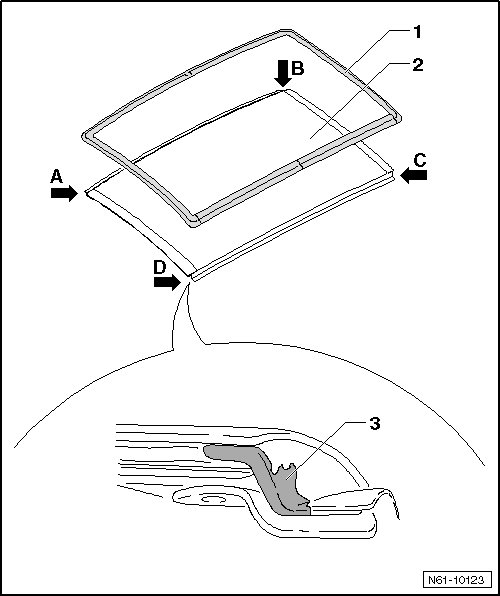- With seal removed - 1 -, clean seal contact surfaces on roof center section - 2 -.