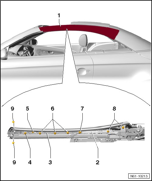 - Check position of bolt - 7 - on roof pillar. Correct number of spacer plates.