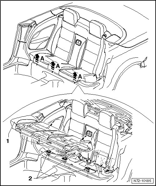 - In front area, pull the bench seat - 1 - up and out of the three mounts - 2 - - arrows A -.