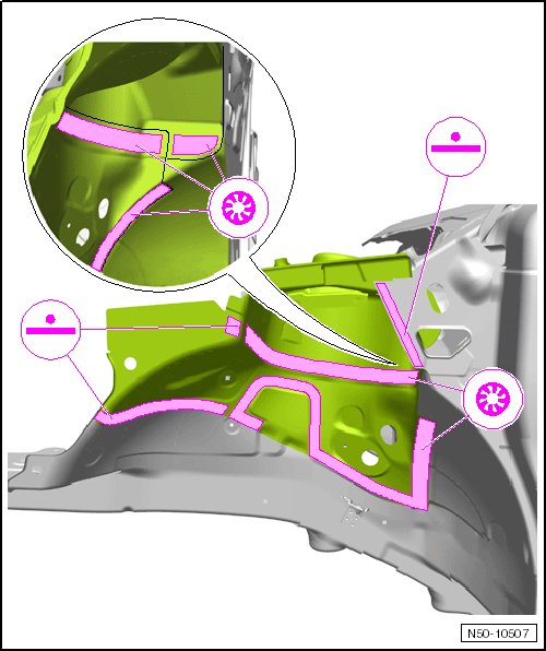 - Weld suspension strut mounting - green - with reinforcement - gray -, gas-shielded arc plug weld.