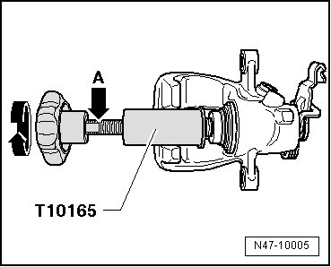 The automatic adjustment in brake caliper is destroyed when piston is moved with piston resetting tool (for example T10145) or brake pedal is operated.
