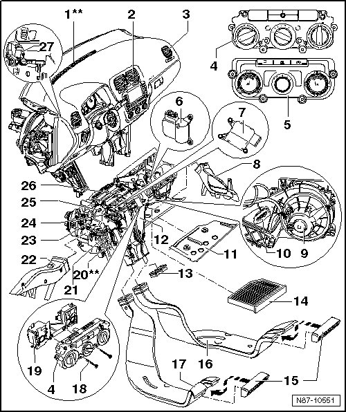 • Removing and installing, refer to => [ Fresh Air Blower Series Resistor with Fuse (N24) ] Service and Repair.