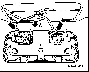 - Pull interior light out of trim at lower roof cross member - arrow A - and disconnect harness connectors - arrows -.