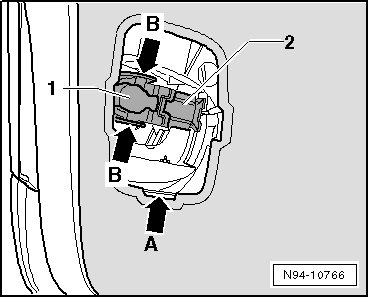 - Push both retaining tabs - arrows B - outward and remove lamp carrier from tail lamp housing.