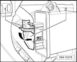 - Disengage securing bracket -1- in -direction of arrow- and disconnect harness connector -2- from Headlamp Range Control Module J431.