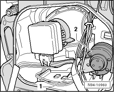 - Carefully set headlamp beam adjusting motor ball head - arrow - in socket - 2 - while moving reflector rearward.
