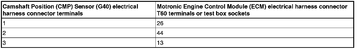 - Using a Multimeter, Check the Camshaft Position (CMP) Sensor (G40) electrical harness connector terminals 1 to 3 for voltage.