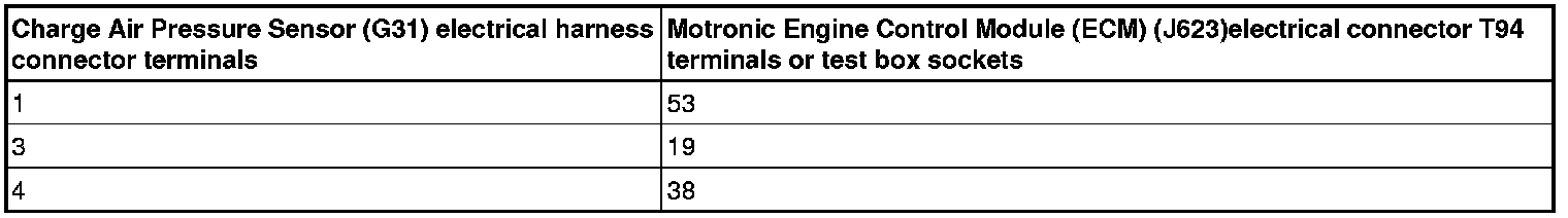 - Using a multimeter, check the Charge Air Pressure Sensor (G31) electrical harness connector terminals to the Motronic Engine Control Module (ECM) (J623)electrical harness connector T94 terminals for an open circuit according to wiring diagram.