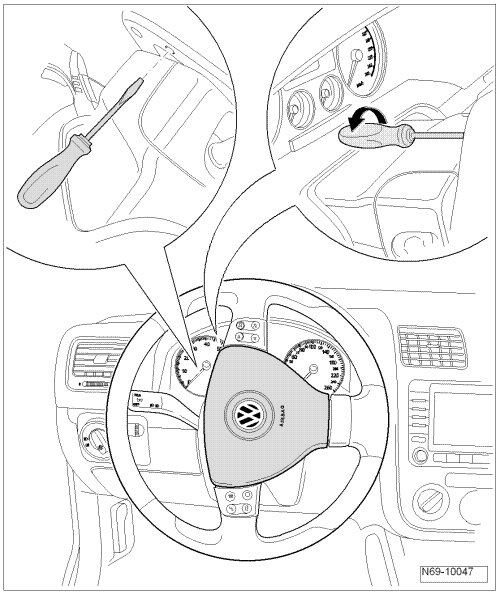 - Turn the screwdriver in the direction of passenger side door - arrow -; this unlocks the airbag unit locking frame on the right side of the steering wheel.