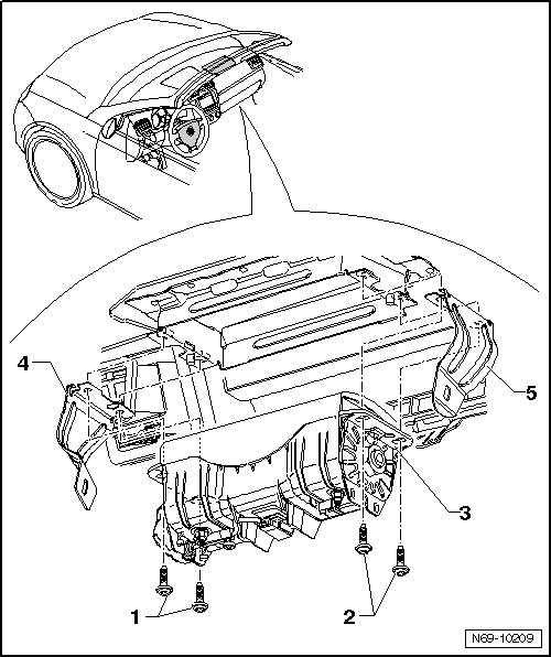 • If a passenger airbag housing consists of plastic, screws - 1 - and - 2 - (9 Nm) should be inserted with locking compound D 197 300 A1.