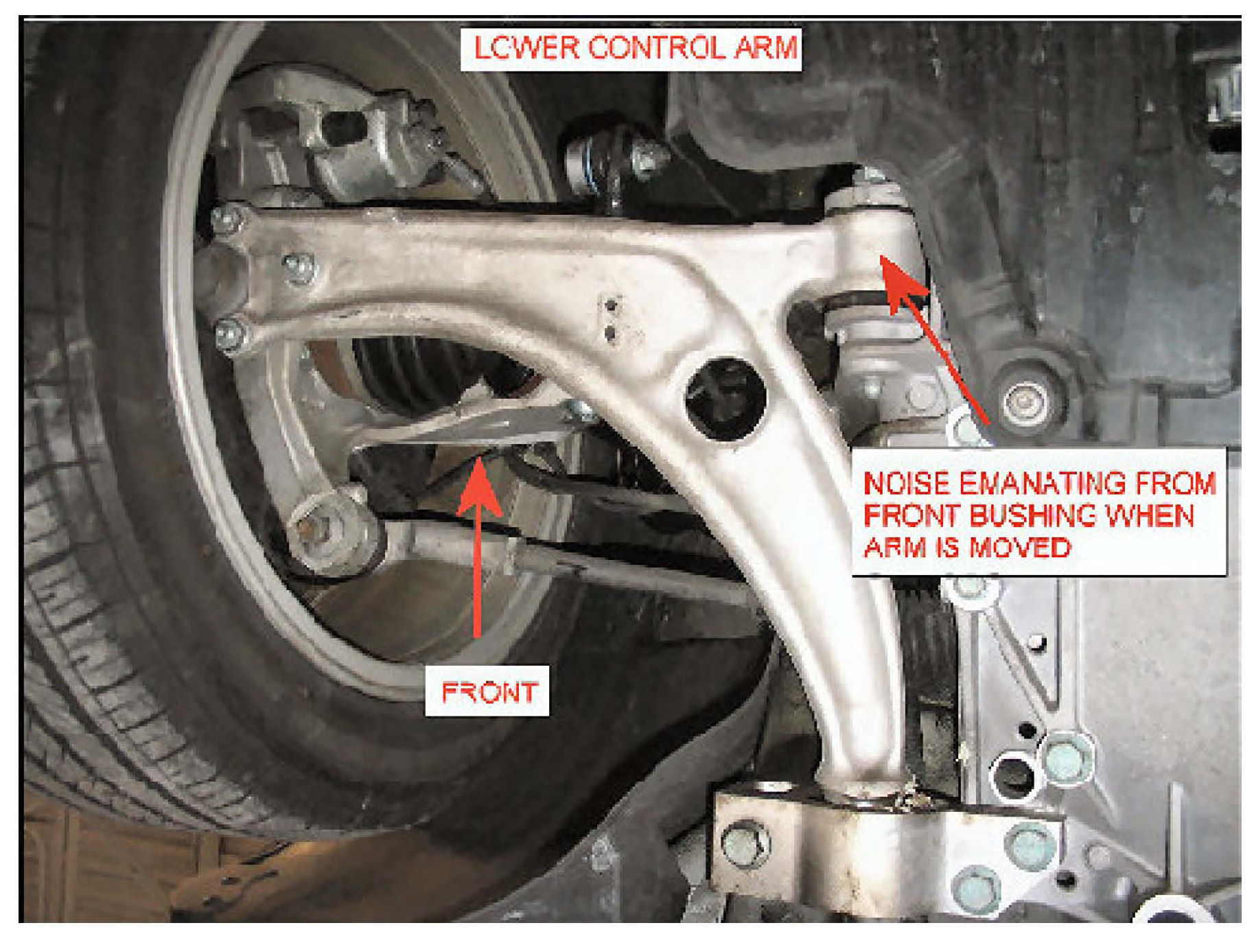 Bonded rubber bushing at front inboard attachment of lower control arm may be noisy.