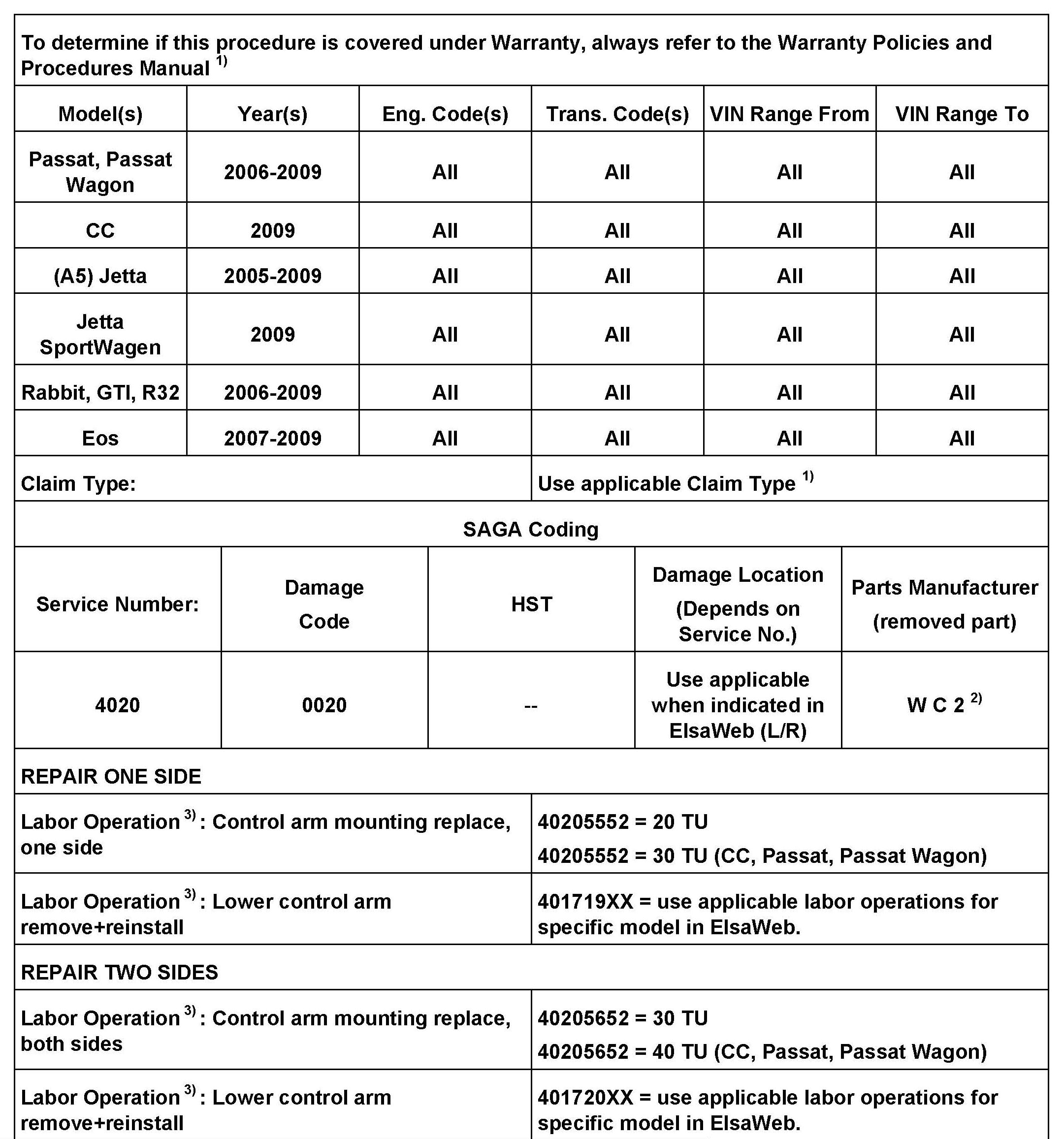 ^ Replace the bonded front bushing (NOT the control arm), see Repair Manual Group 40 Front Suspension, Subframe, Stabilizer Bar, Control Arm, Bonded Rubber Bushing in ElsaWeb.