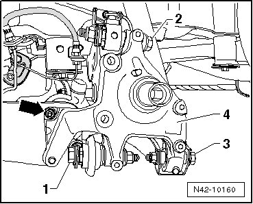 - Remove bolt for tie rod - 1 -, upper transverse link - 2 - and lower transverse link - 3 - from wheel bearing housing - 4 -.