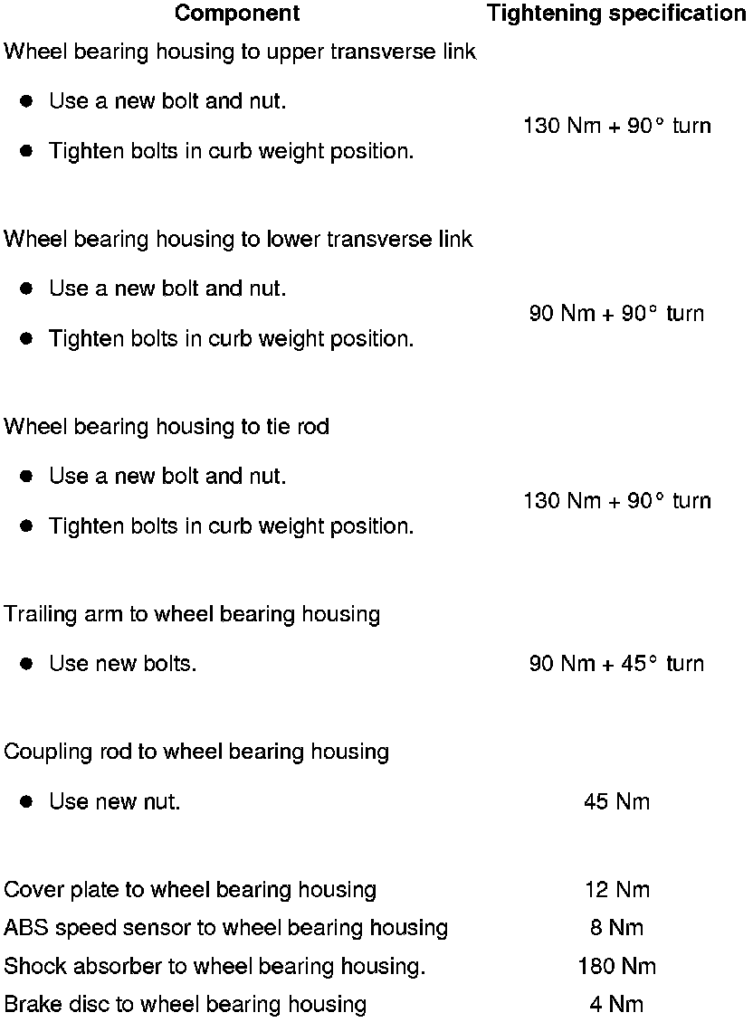 Threaded connection of trailing link/wheel bearing housing must only be tightened when all other components (spring and strut always) of the respective wheel suspension have been already assembled. To tighten, suspension must be unloaded. Only now do the trailing link and wheel bearing housing move into the position required - arrows -.