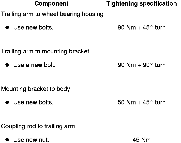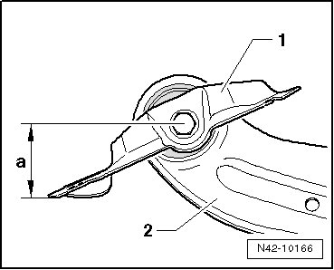 - Fasten bolts - 2 - for trailing arm to torque specification, making sure of the required positioning of the components. Refer to => [ Position: Threaded Connection of Trailing Arm/Wheel Bearing Housing ].