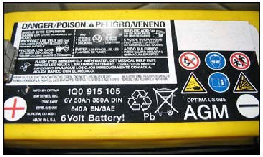 The EOS 3.2L engine is equipped with 2-6V AGM batteries which are connected in series to achieve 12V.The 2-6V battery system must always be treated as a 12V battery system.Never attempt to charge only one 6V battery.If battery replacement is necessary, never replace one 6V battery; both batteries must be replaced as a pair! See photo below for reference.