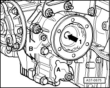 • The seal - arrow - in the driveshaft flange must not be damaged when removing the transmission. If the seal is damaged, the driveshaft must be replaced.