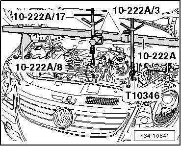 - Then, lower the engine/transmission slightly using the engine support bridge (10-222 A) spindles until the bracket can be removed.
