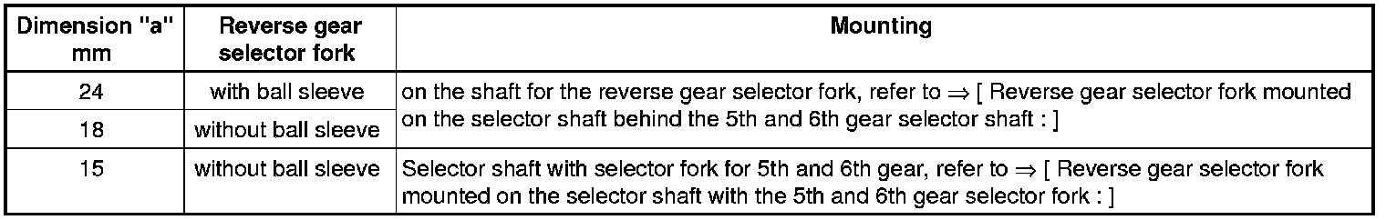 If the shaft for the reverse gear selector fork is deleted, the bearing on the selector shaft for the 5th and 6th gear selector fork. Refer to => [ Reverse gear selector fork mounted on the selector shaft with the 5th and 6th gear selector fork : ] Transmission, with a Sealing Cap Circlip for the Input Shaft.