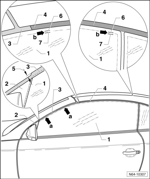 Side window must guide into seal - 3 - between - b arrows - the lower - 7 - and upper marking - 6 -.