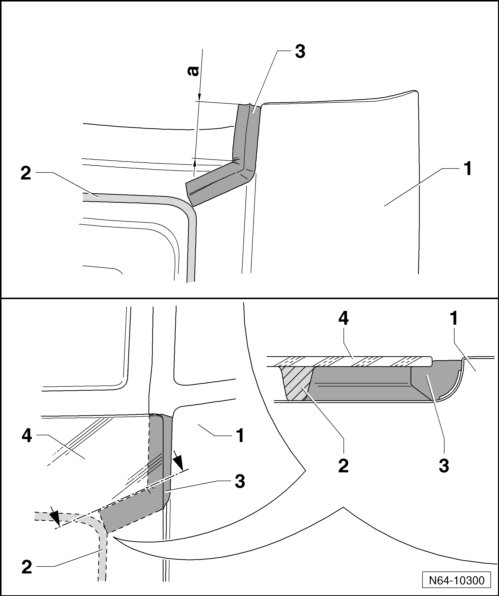 - Bond the sealing foam band (D 542 025 A2) - 3 - 35 mm - dimension a - to the left and right along the edge of the rear window opening - 1 -.