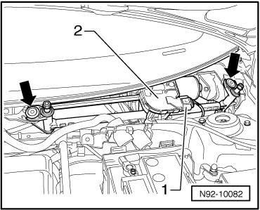 - Remove mounting bolts - arrows - and swing wiper motor and frame - 2 - upward and out of vehicle.