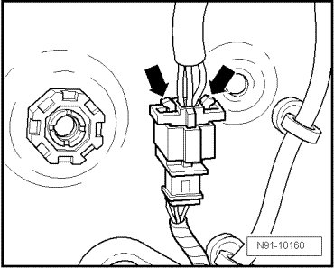 - Release locking mechanism of harness connector - arrows - and disconnect it.