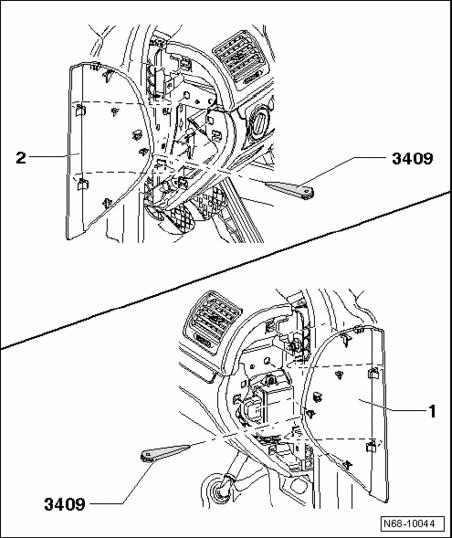 - Using trim removal wedge 3409, pry right side instrument panel cover - 1 - out of locking mechanisms.