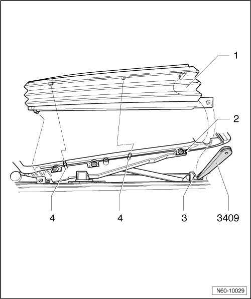 - Carefully unclip bellows - 1 - from lower section of slotted guide rail - 3 - using a trim removal wedge (3409).