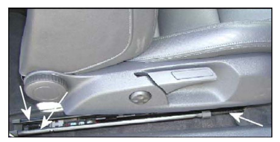 ^ Slide seat bottom forward and apply 3M Silicone Lubricant (Dry Type) Part No. 051135-08897 or equivalent, -arrows-, to exposed inner and outer track rails/channels.
