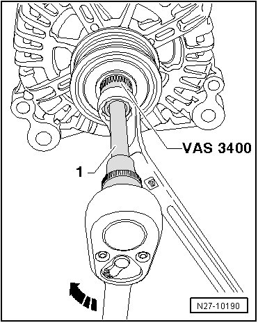 - Insert multi-point adapter (VAS 3400) into ribbed belt pulley with freewheel of generator using open end wrench 17 mm.