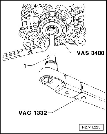 - Tighten ribbed belt pulley with freewheel by turning generator driveshaft toward left using torque wrench (V.A.G 1332).