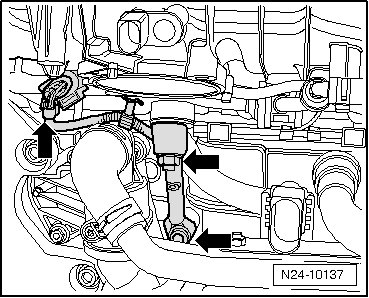 - Disconnect the coolant pipe and oil dipstick guide from the intake manifold - arrows - and pull the oil dipstick guide upward out of the engine.
