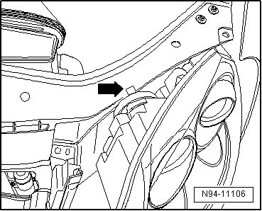 - Pull the tip of the bumper cover - arrow - on the inside of the headlamp forward until the inner headlamp mounting point can be guided past the bumper cover.