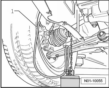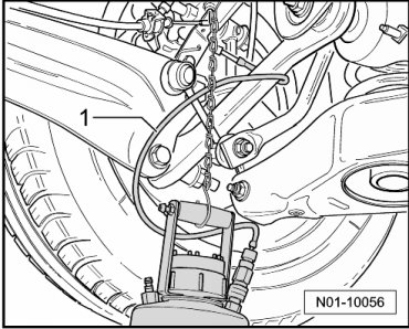 - Connect collector bottle bleeder hose - 1 - to left front bleeder screw, open bleed screw and allow the corresponding quantity to flow out (see table). Close bleeder screw. Torque: Chassis, Brake System=> Chassis, Brake System 47 Brake Caliper, ServicingBrake Caliper, Servicing