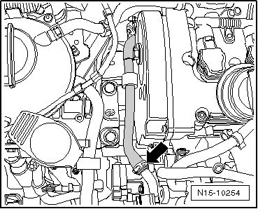 - Loosen the clamp - arrow - and disconnect the coolant hose. Collect any leaking coolant with a cloth.