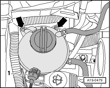 - Disconnect the connector - 1 - from the expansion tank. Loosen the bolts and lay it on its side.