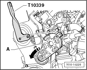 - Remove the ribbed belt tensioner - A - and install the (T10339) using both upper threaded holes.