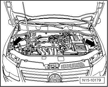 - Remove the upper toothed belt guard bolts - arrows - and remove the upper toothed belt guard.