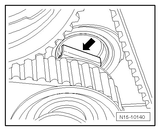 - Route the toothed belt in the following sequence: semi automatic tensioning roller, camshaft gear, coolant pump, and finally around the idler roller - arrow -.